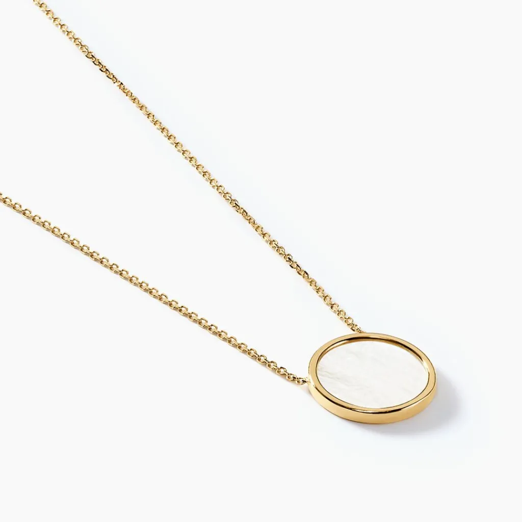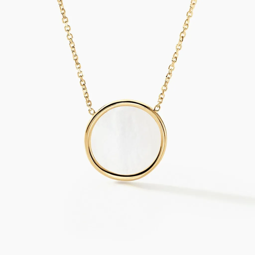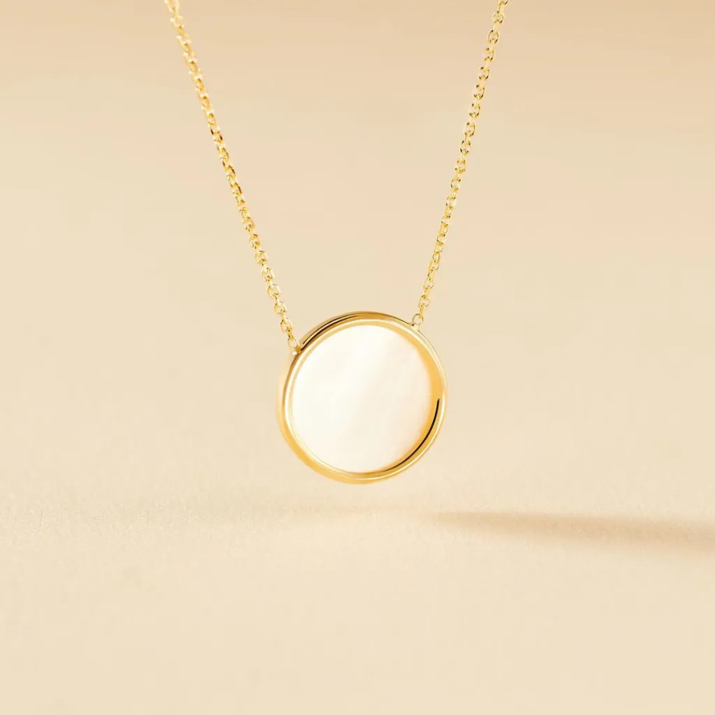 Collier Or Jaune 375/1000 Pastille Nacre Blanche Serti Clos Maille Jaseron 42cm