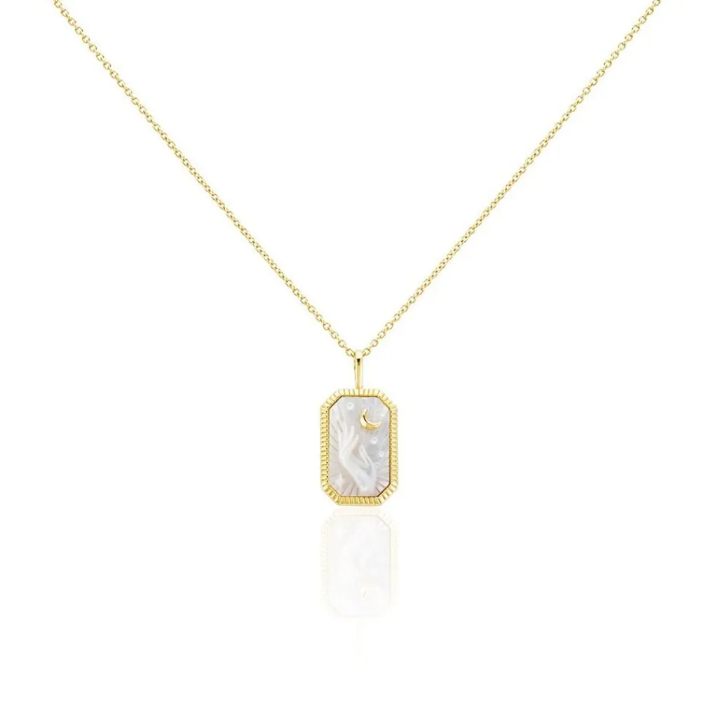 Collier Argent Doré 925/1000 Plaque Rectangulaire Nacre Blanche Gravure Theme Astral Maille Forçat 45cm