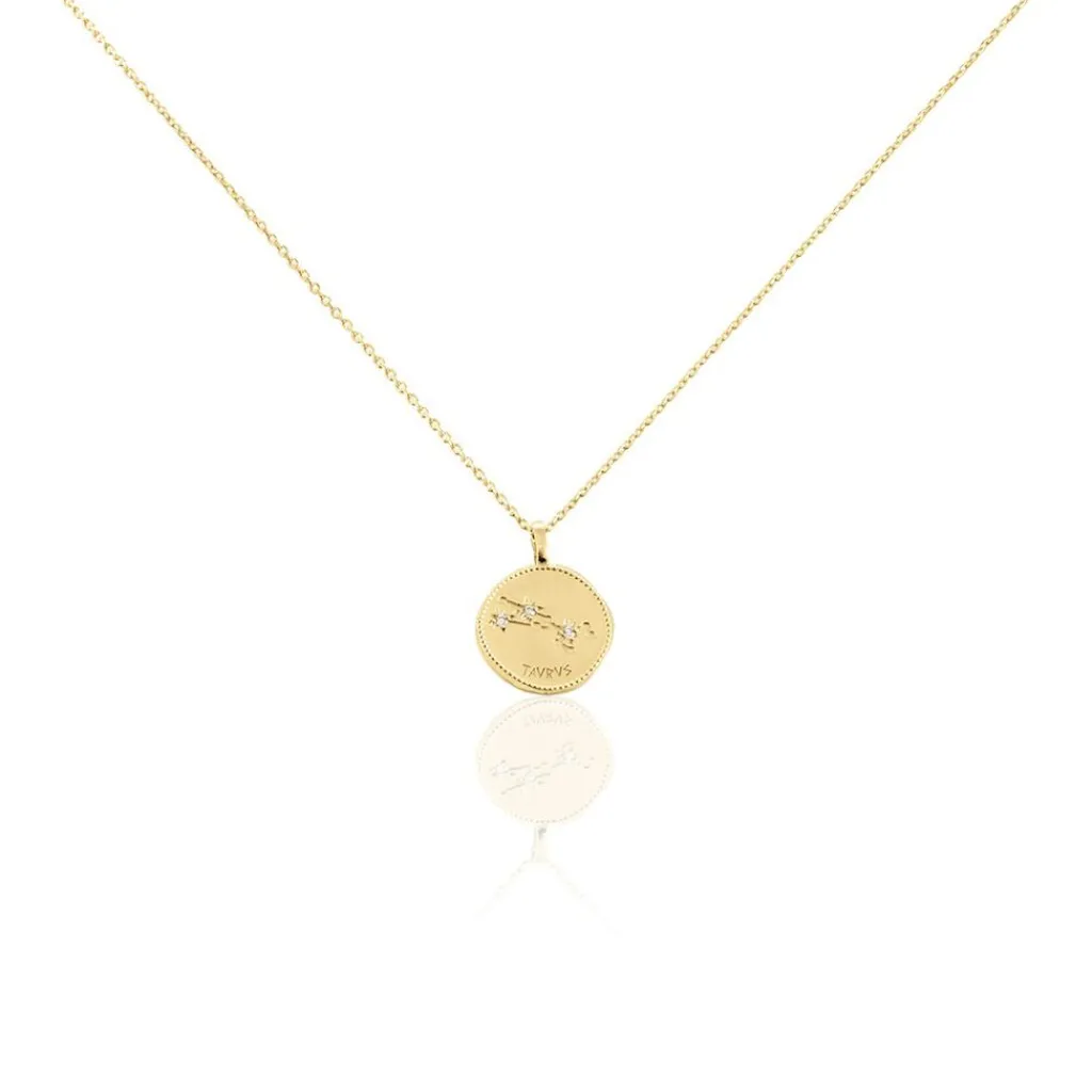 Collier Plaqué Or Jaune Pastille Mate Signe Astrologique Taureau Oxydes De Zirconium Chaine Forcat 50cm