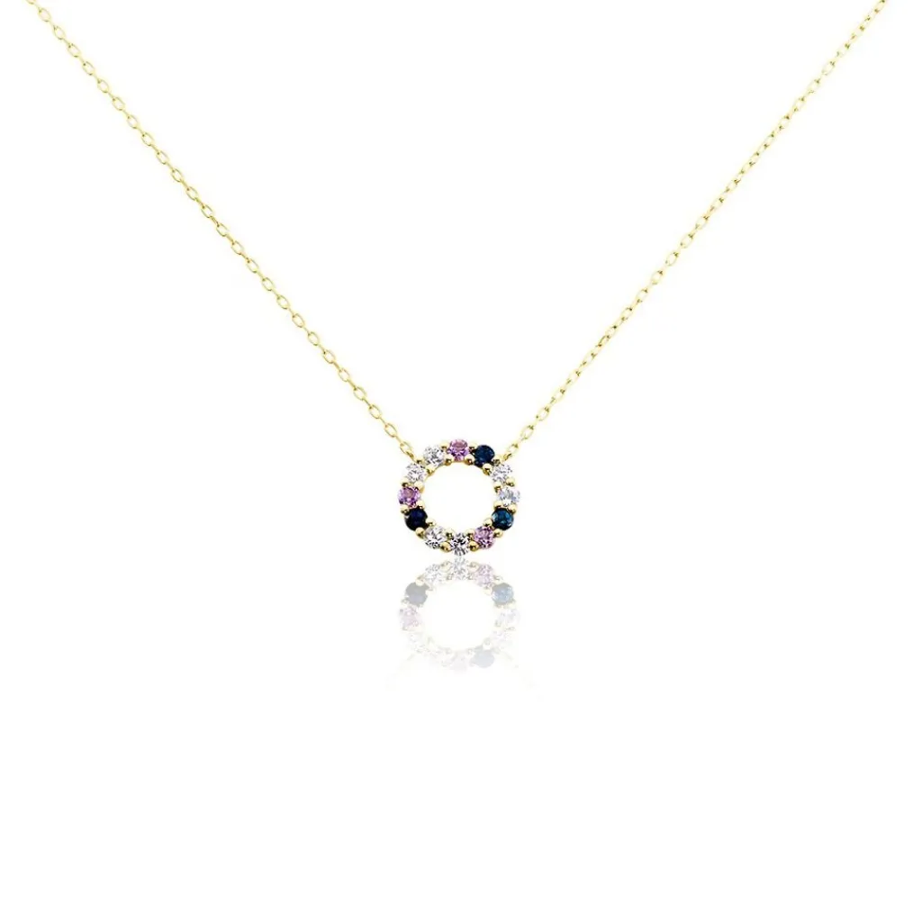 Collier Or Jaune 375/1000 Cercle Ajoure Amethyste Topaze Oxyde De Zirconium Serti Griffes Maille Forcat Ronde 40+2cm