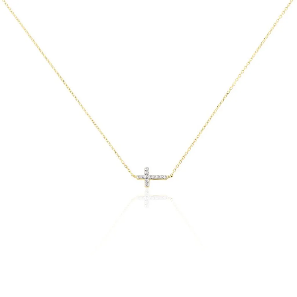 Collier Or Jaune 375/1000 Croix Oxydes De Zirconium Micro Serti Maille Forçat 42cm