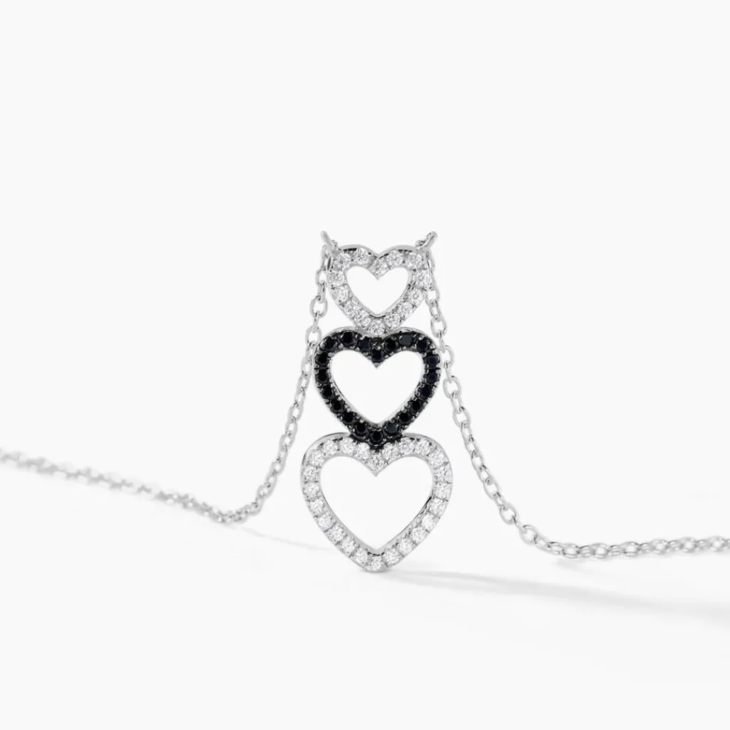 Collier Argent 925/1000 lio Triple C艙urs Ajoures Paves Oxydes De Zirconium Noirs Et Blancs 45cm