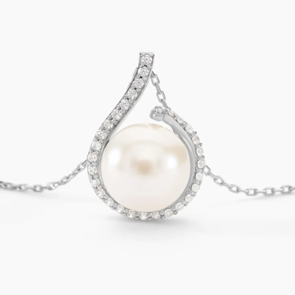 Collier Or Blanc 375/1000 Perle De Culture 8mm Spirale Oxydes De Zirconium 43cm