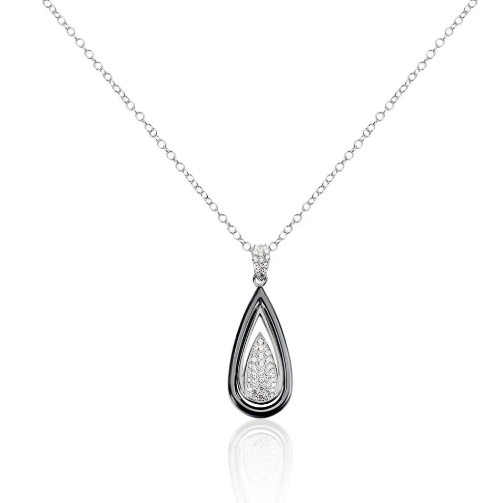 Collier Argent Blanc 925/1000 Forme Goutte Ceramique Noire Et Oxydes De Zirconium 45cm