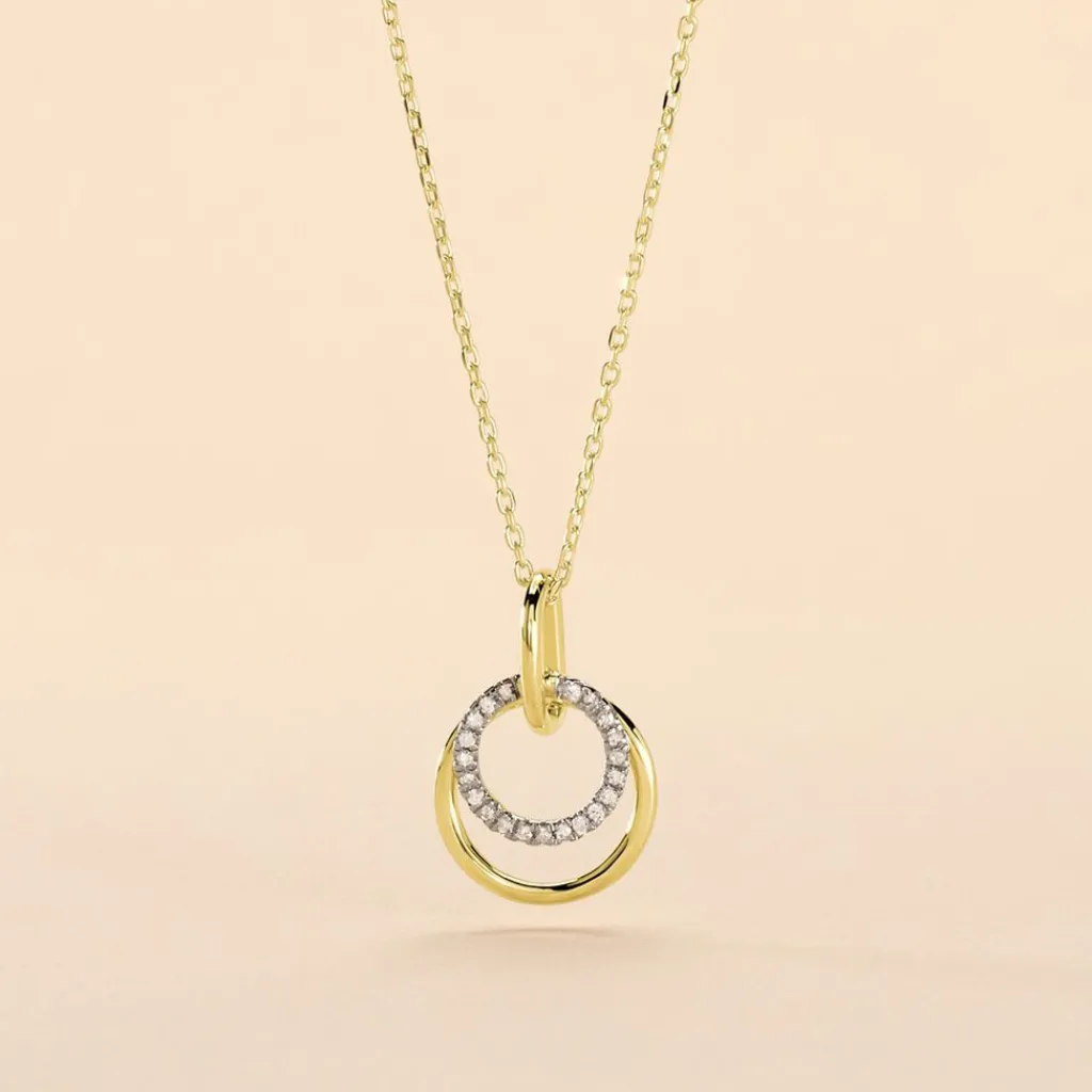 Collier Or Jaune 375/1000 Forme Double Cercle Pavage Diamants 42cm
