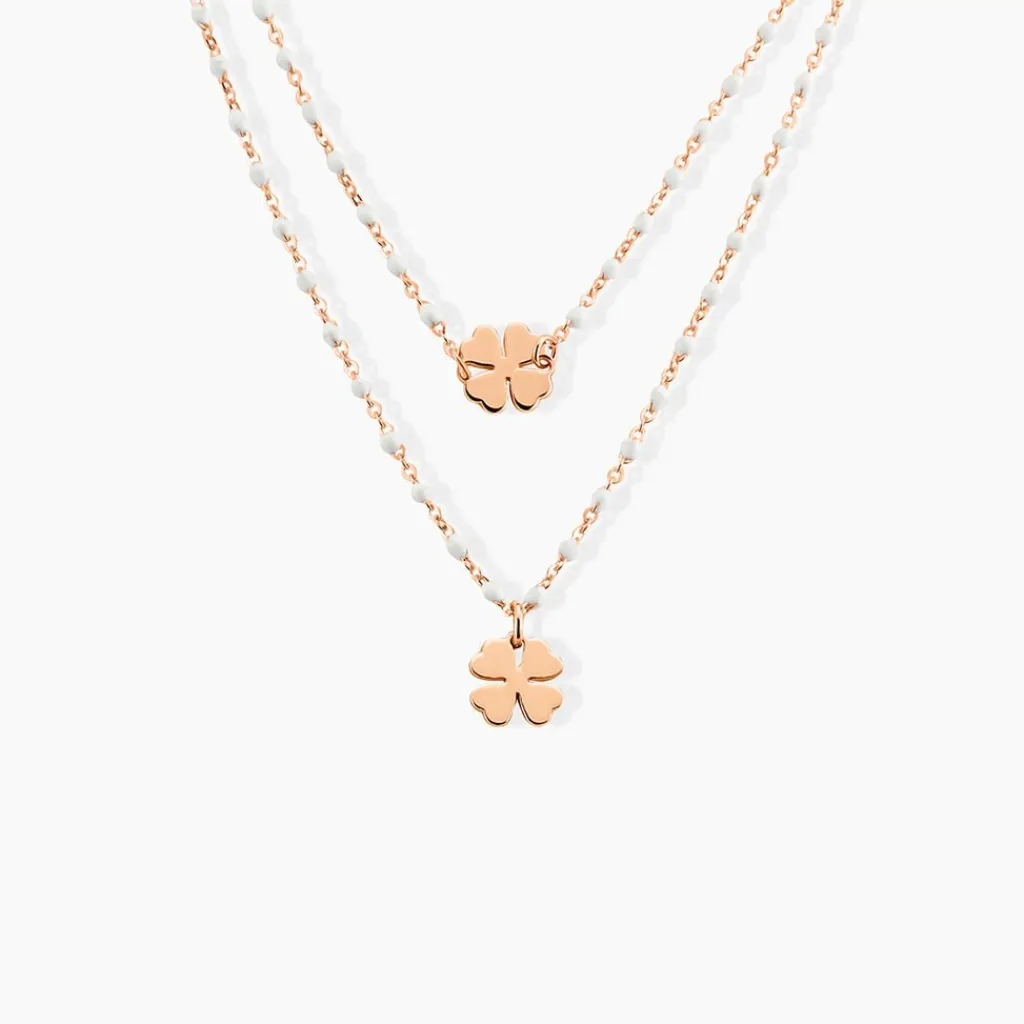 Collier Argent Rose 925/1000 Trèfles Boules émail Blanc Double Rang Mailles Boules 35+3cm