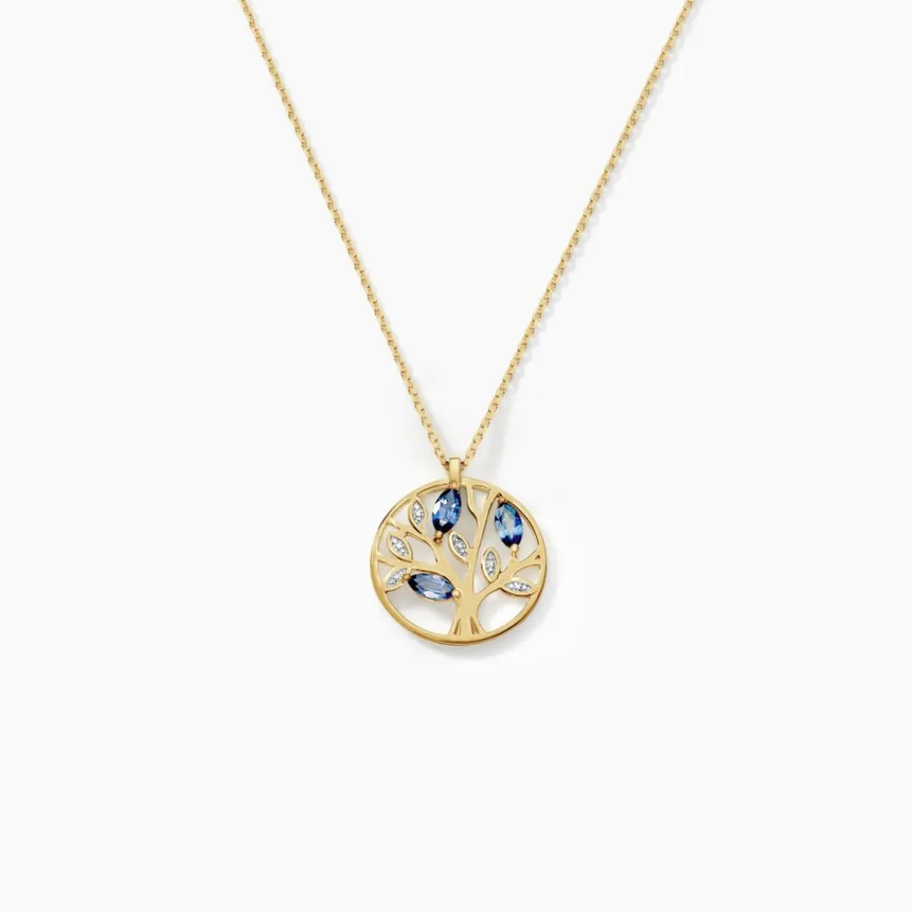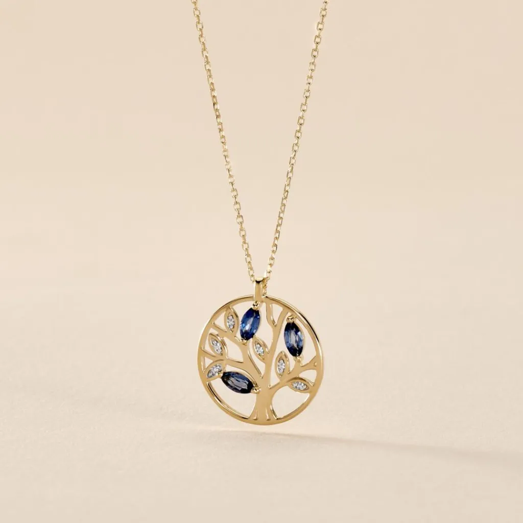 Collier Or Jaune 375/1000 Arbre De Vie Saphirs Formes Navettes 40+2cm