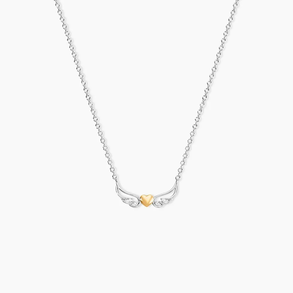 Collier Or Jaune 375/1000 Et Argent Blanc 925/1000 Ailes Oxydes De Zirconium Blancs Et C艙ur Central Maille Forcat Ronde 40+2Cm