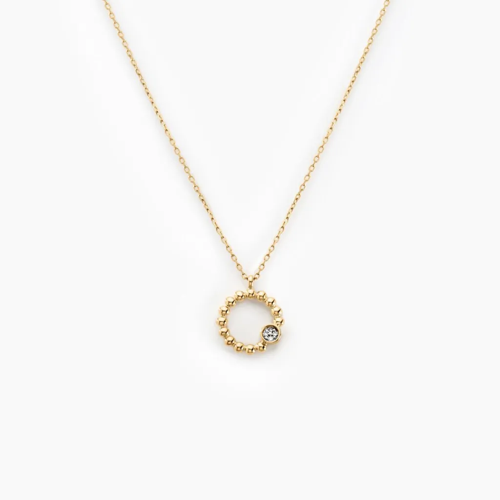 Collier Or Jaune 375/1000 Pastille Sur Cercle Effet Perle Pavage Diamants 0.015cts Maille Forcat 42+2cm