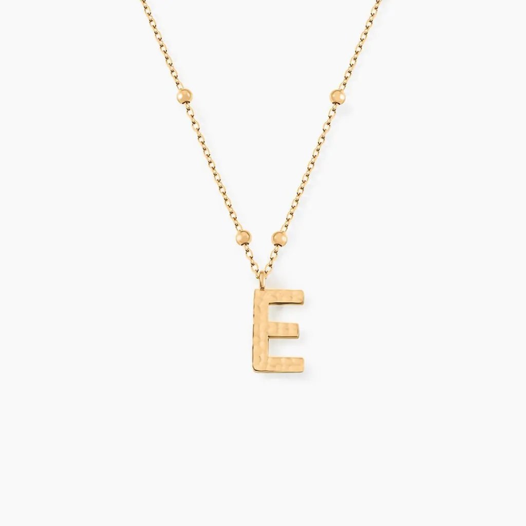Collier Plaque Or Jaune Lettre E Martelee Et Petites Boules Chaine Maille Forcat Longueur 45cm