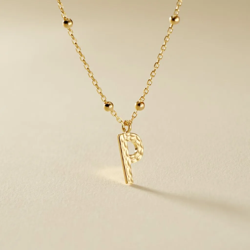 Collier Plaque Or Jaune Lettre P Martelee Et Petites Boules Chaine Maille Forcat Longueur 45cm