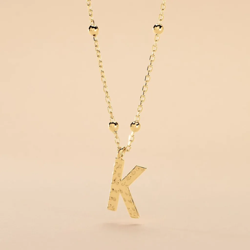 Collier Plaque Or Jaune Lettre K Martelee Et Petites Boules Chaine Maille Forcat Longueur 45cm