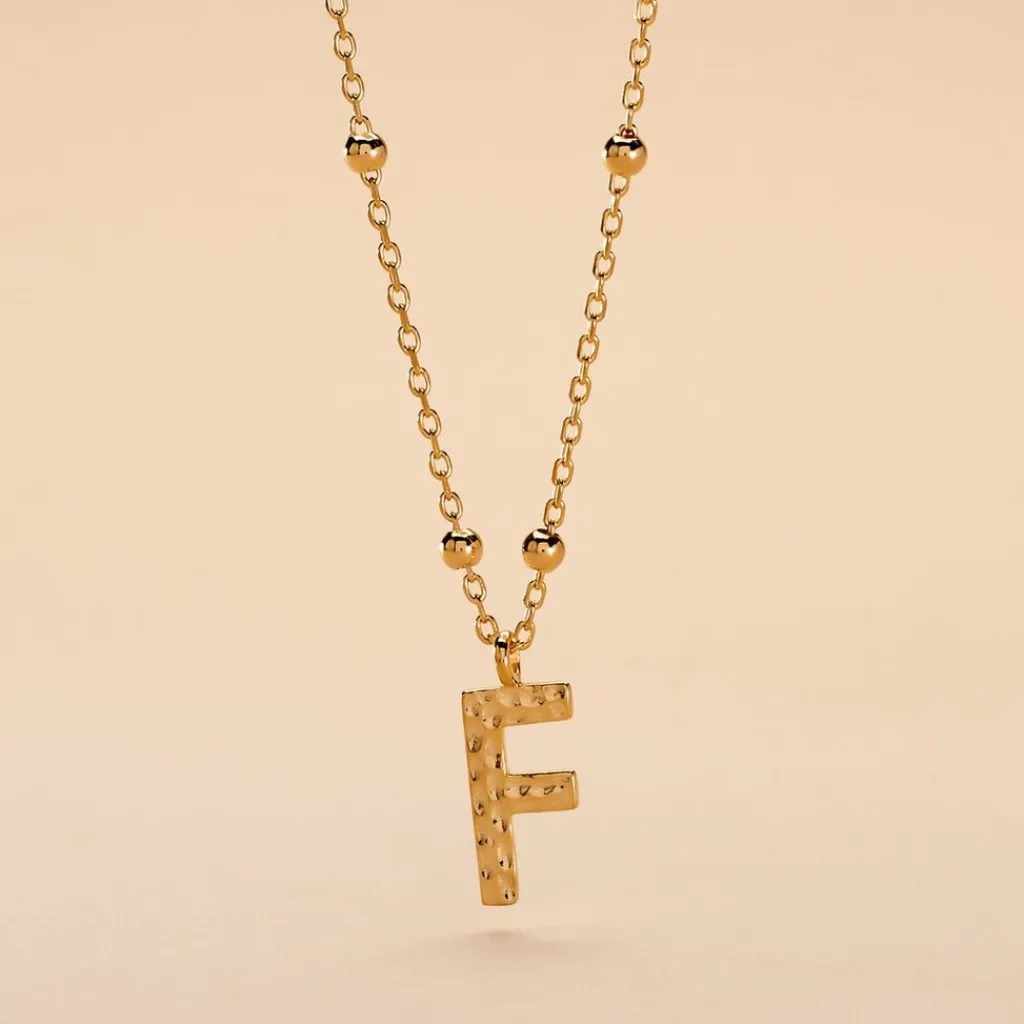 Collier Plaque Or Jaune Lettre F Martelee Et Petites Boules Chaine Maille Forcat Longueur 45cm
