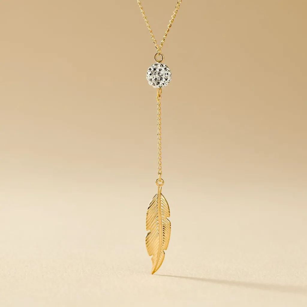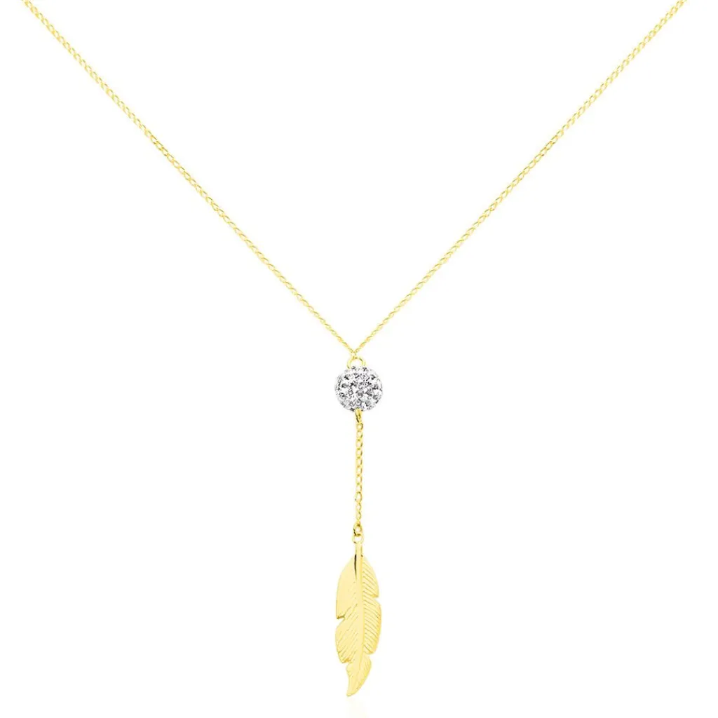 Collier Or Jaune 375/1000 »powoo » Plume Strass Blanc Maille Cheval 42cm