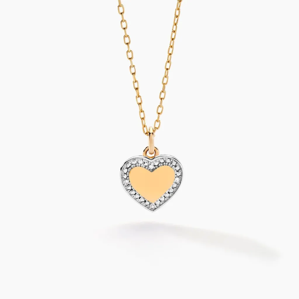 Collier Or Jaune 375/1000 Coeur Gravable Diamants 0.009cts Illusion Maille Forcat 42+3cm
