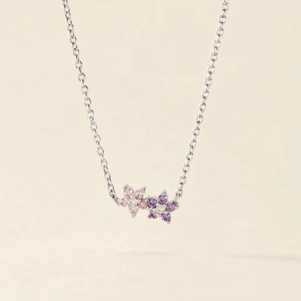 Collier Argent Blanc 925/1000 2 Fleurs Oxydes De Zirconium Violets Et Roses Maille Forcat 42+3cm