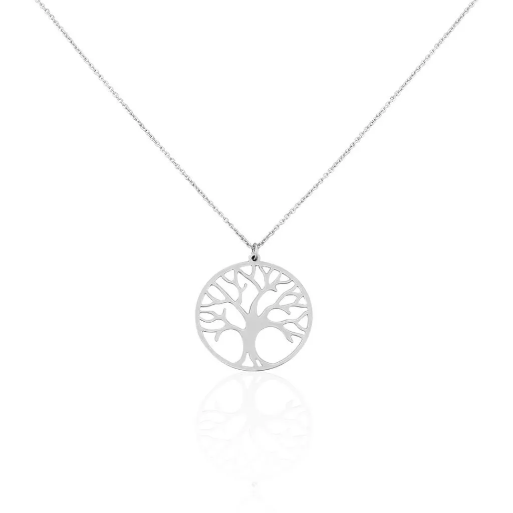 Collier Sautoir Argent Blanc 925/1000 Arbre De Vie Maille Forcat 70cm