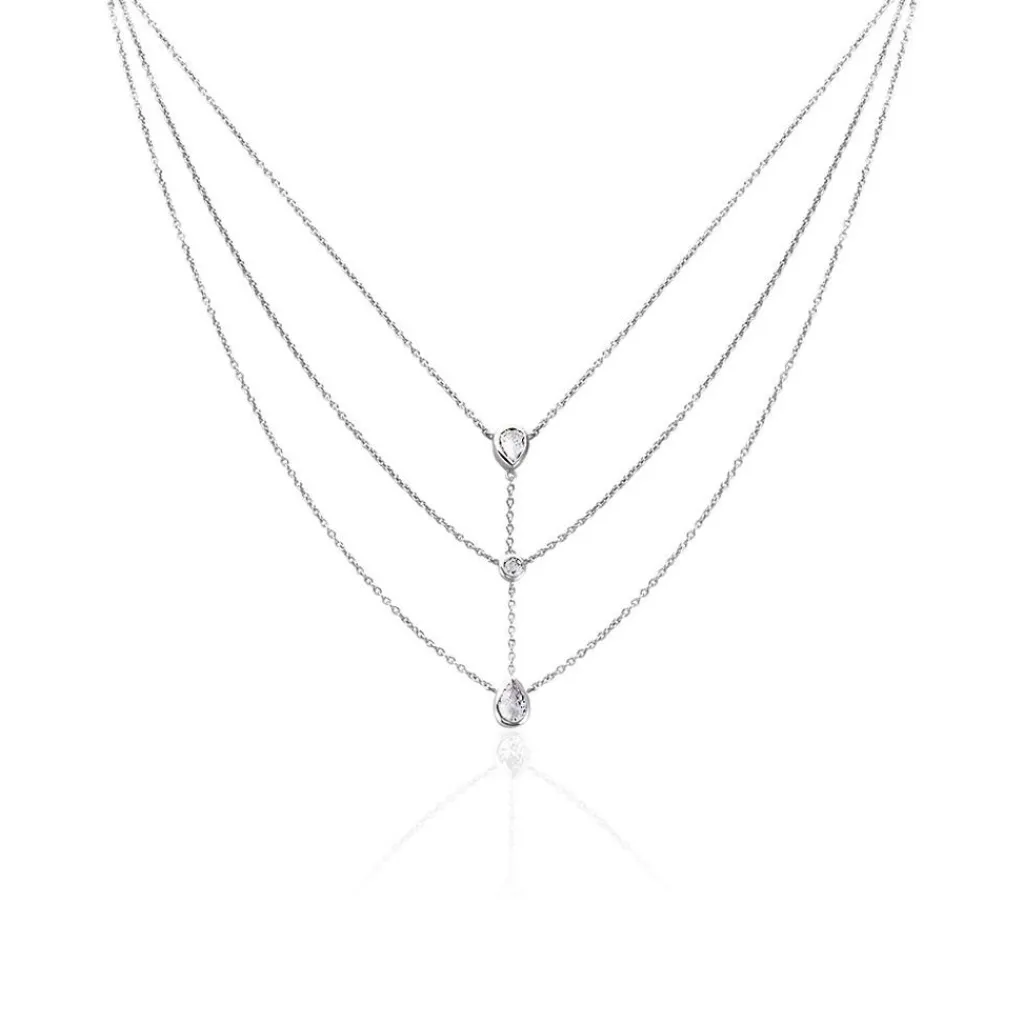 Collier Argent Blanc 925/1000 Triple Chaine Goutte Et Cercle Oxydes De Zirconium Maille Jaseron 38+2cm
