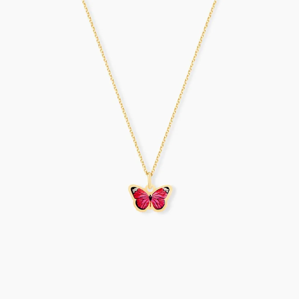 Collier Or Jaune 375/1000 Papillon Smalto Fushia Maille Jaseron 40cm