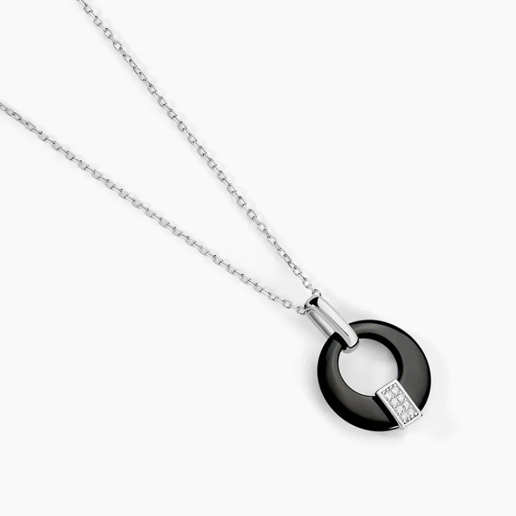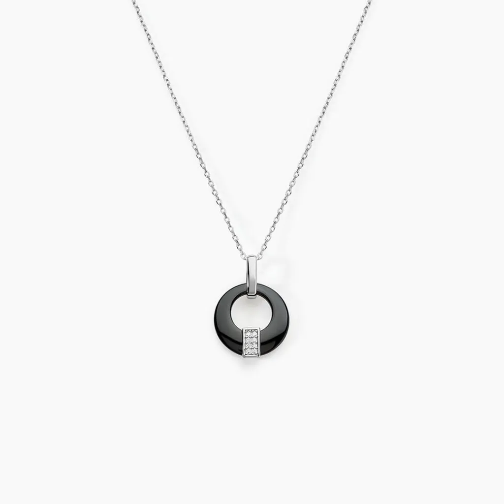 Collier Argent Blanc 925/1000 Ceramique Noire Forme Ronde Ajouree Et Oxydes De Zirconium 42cm