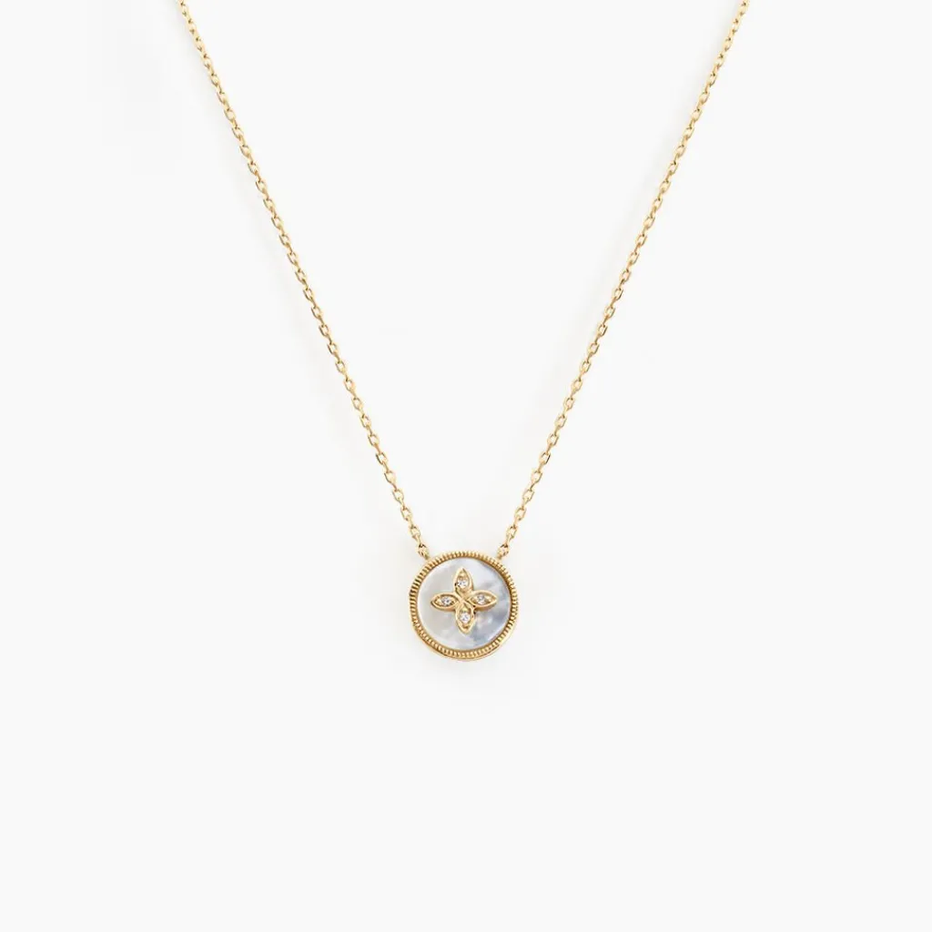 Collier Or Jaune 375/1000 Nacre Blanche Et Motif Fleur Diamants Maille Forçat 40+2cm