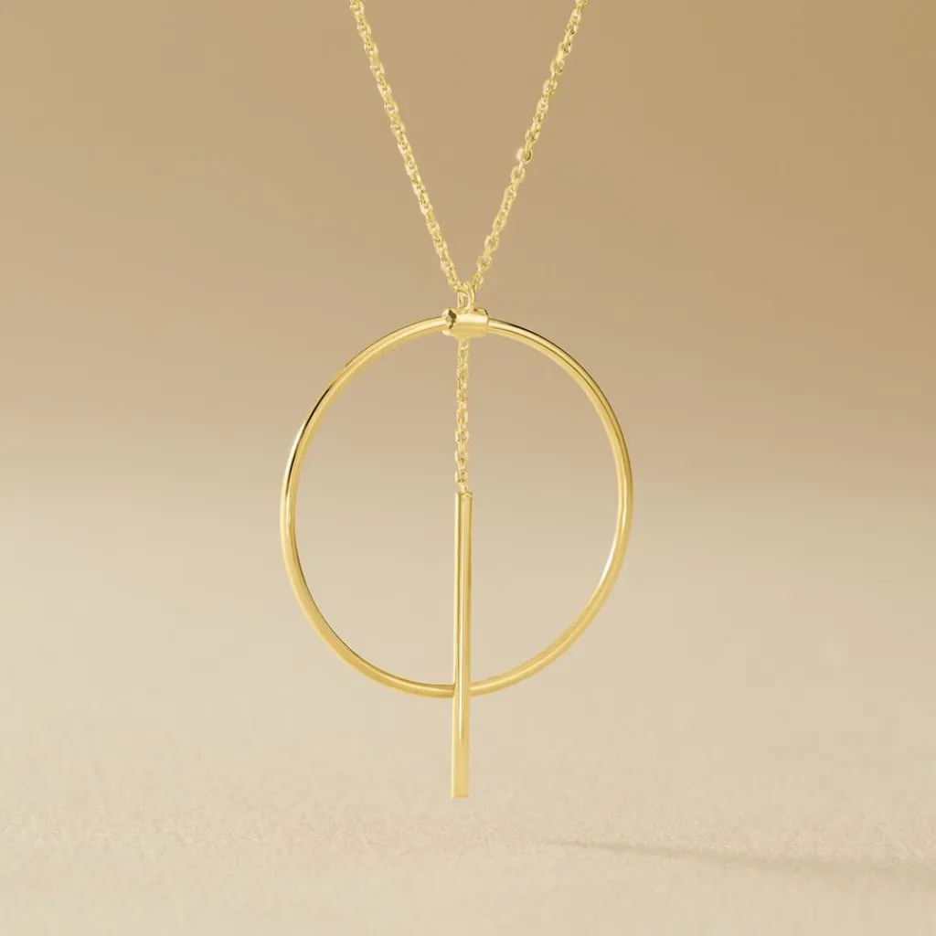 Collier Or Jaune 375/1000 Cercle Ajoure + Petite Barre Pendante Maille Jaseron 42cm