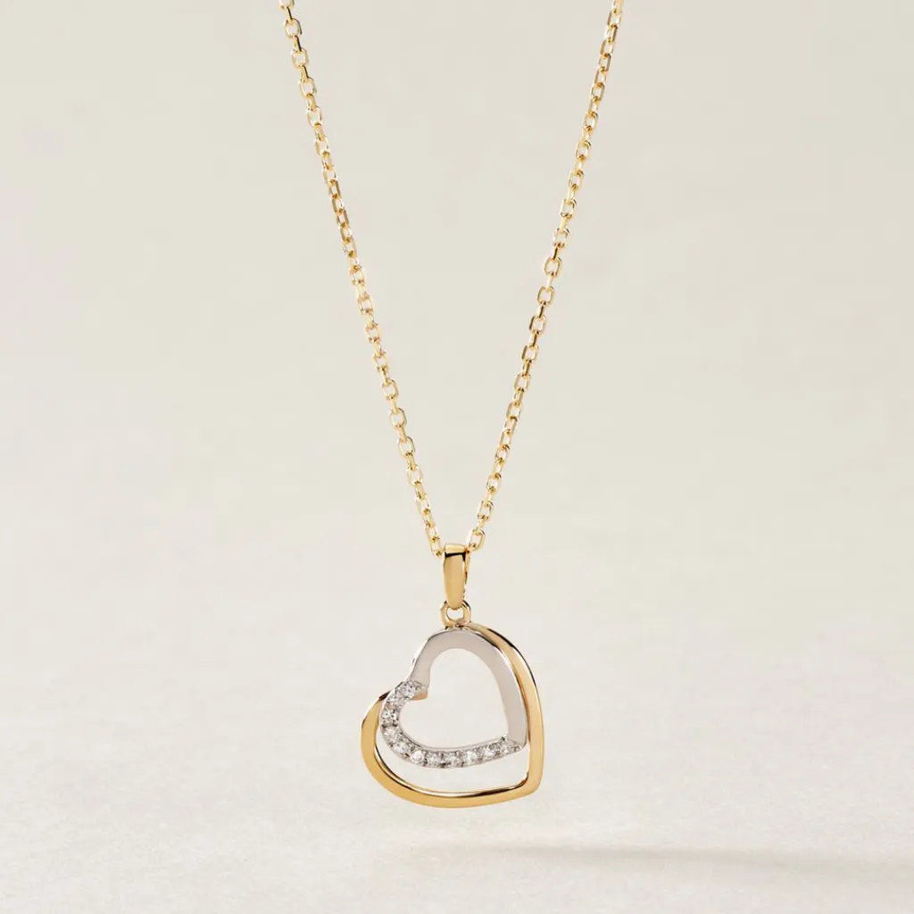 Collier Or 375/1000 Bicolore Jaune Et Blanc Doubles C艙urs Maille Forçat Pavage Diamants 40+2cm