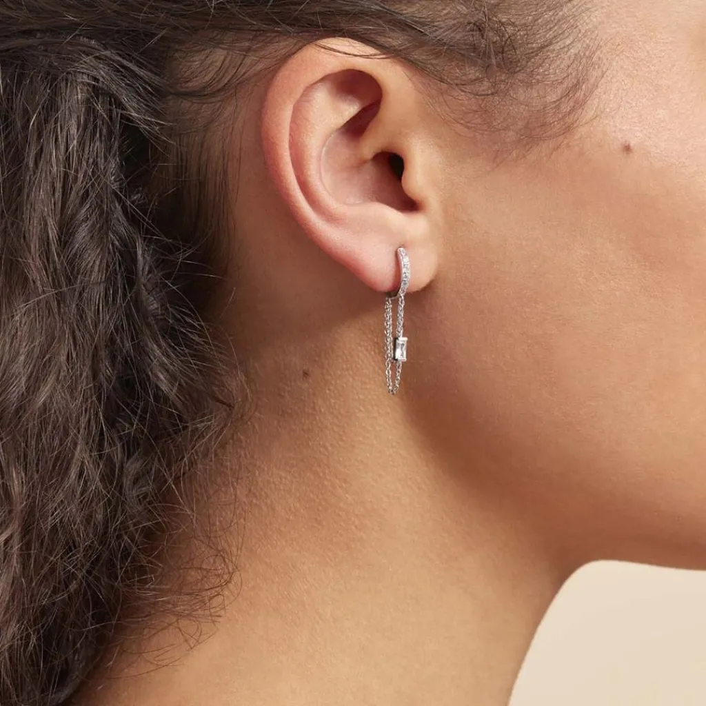 Creole Argent Blanc 925/1000 Pavage Oxydes De Zirconium Double Chaine Serti Clos Oxydes De Zirconium Diametre 14mm