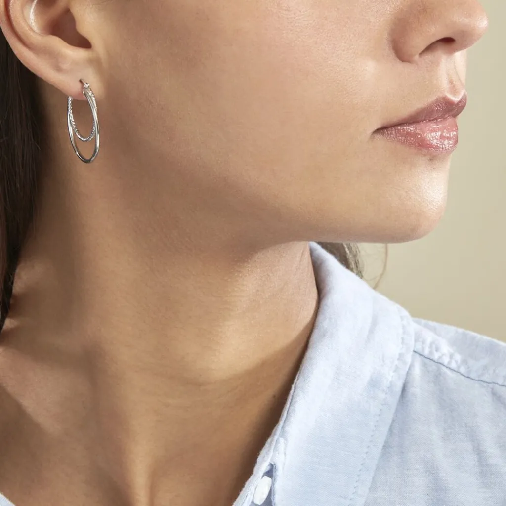 Créoles Argent Blanc 925/1000 Double Fil 1 Lisse 1 Diamante Largeur 1.5mm Diametre 20mm