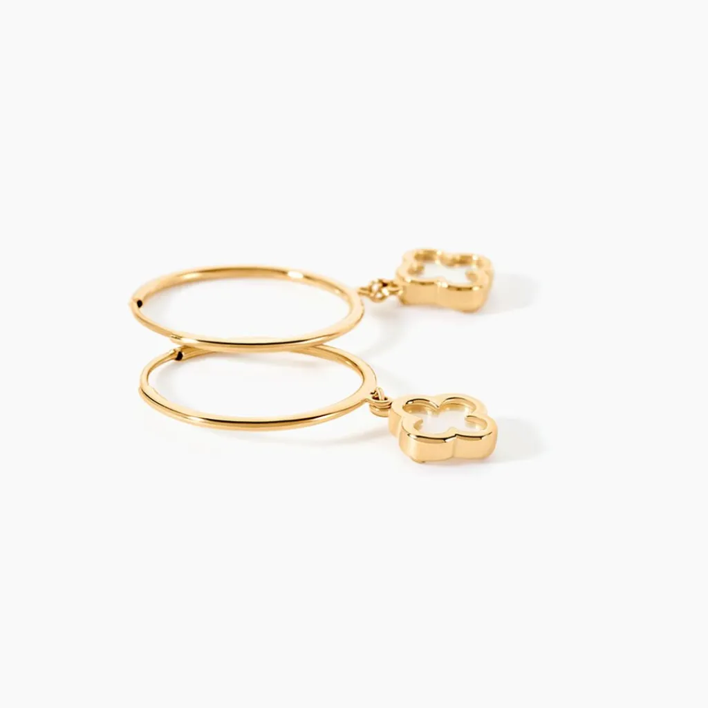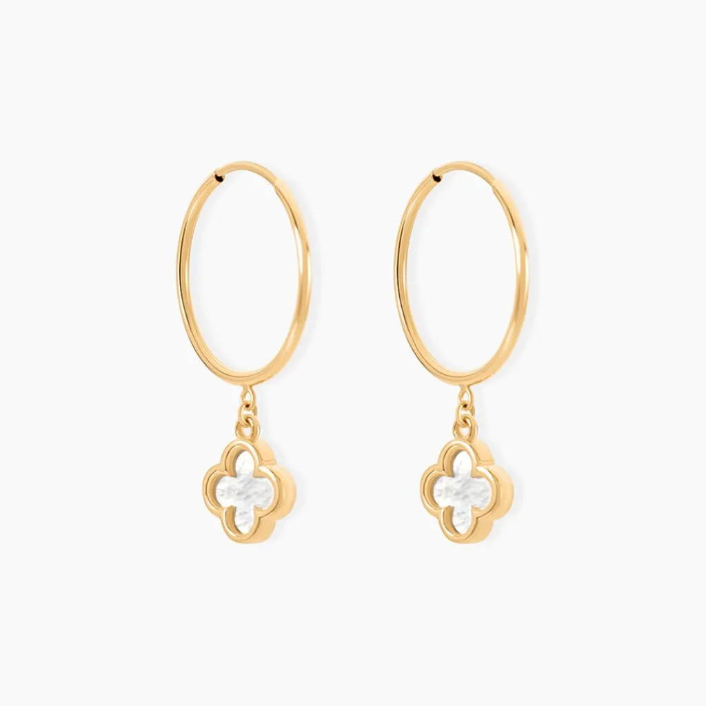Creoles Or Jaune 375/1000 Pampilles Fleurs Nacres Fil Rond Flexible Lisse 14Mm