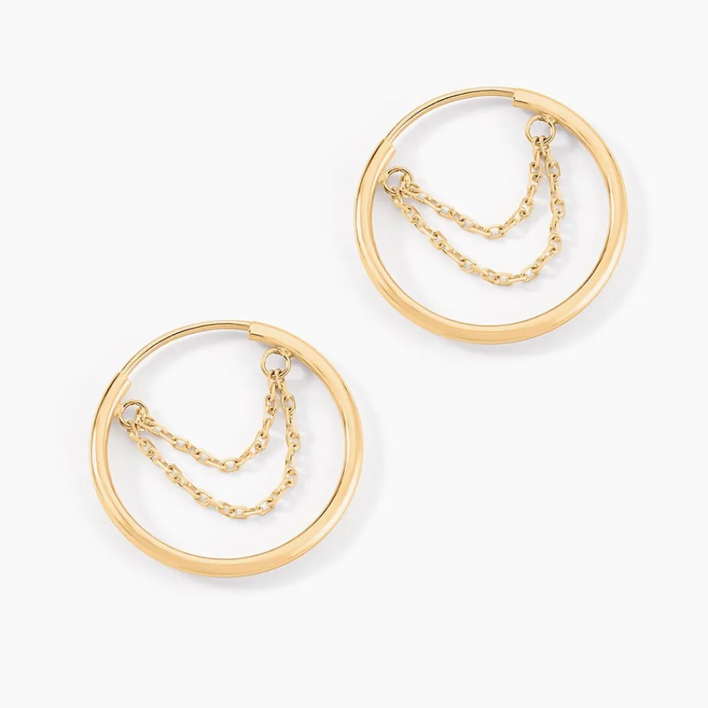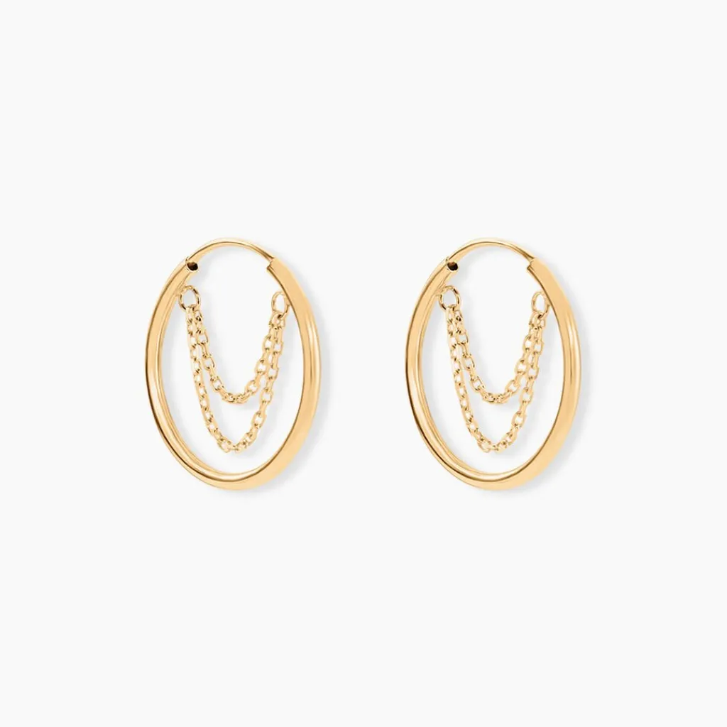 Creoles Pendantes Or Jaune 375/1000 Fil Rond Double Chaine Interieur Forcat Diametre 15mm