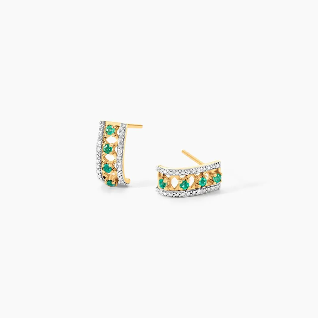 Demi Creoles Or Jaune 375/1000 Emeraudes Rondes 0,16Cts Sertis Griffes Et Pavage Diamants