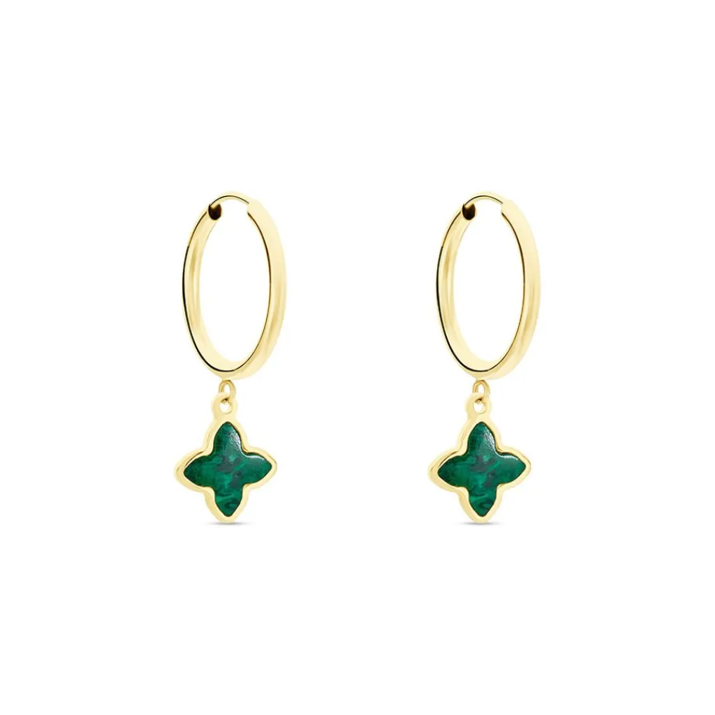 Creoles Or Jaune 375/1000 Pampille Fleur Malachite Verte Fil Flexible Lisse Largeur 1.6mm Diametre 12.35mm