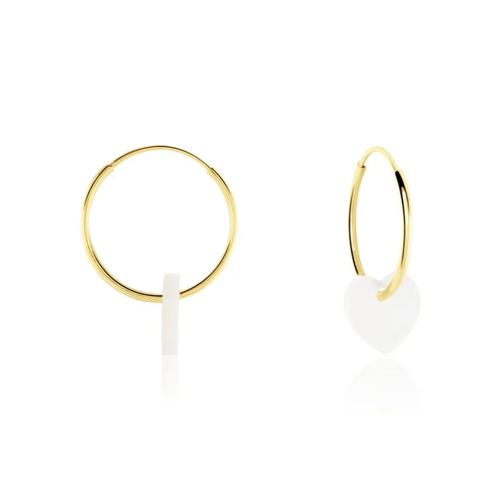 Creoles Or Jaune 375/1000 Pampilles Coeurs Nacre Blanche Largeur 0.8mm Diametre 11mm