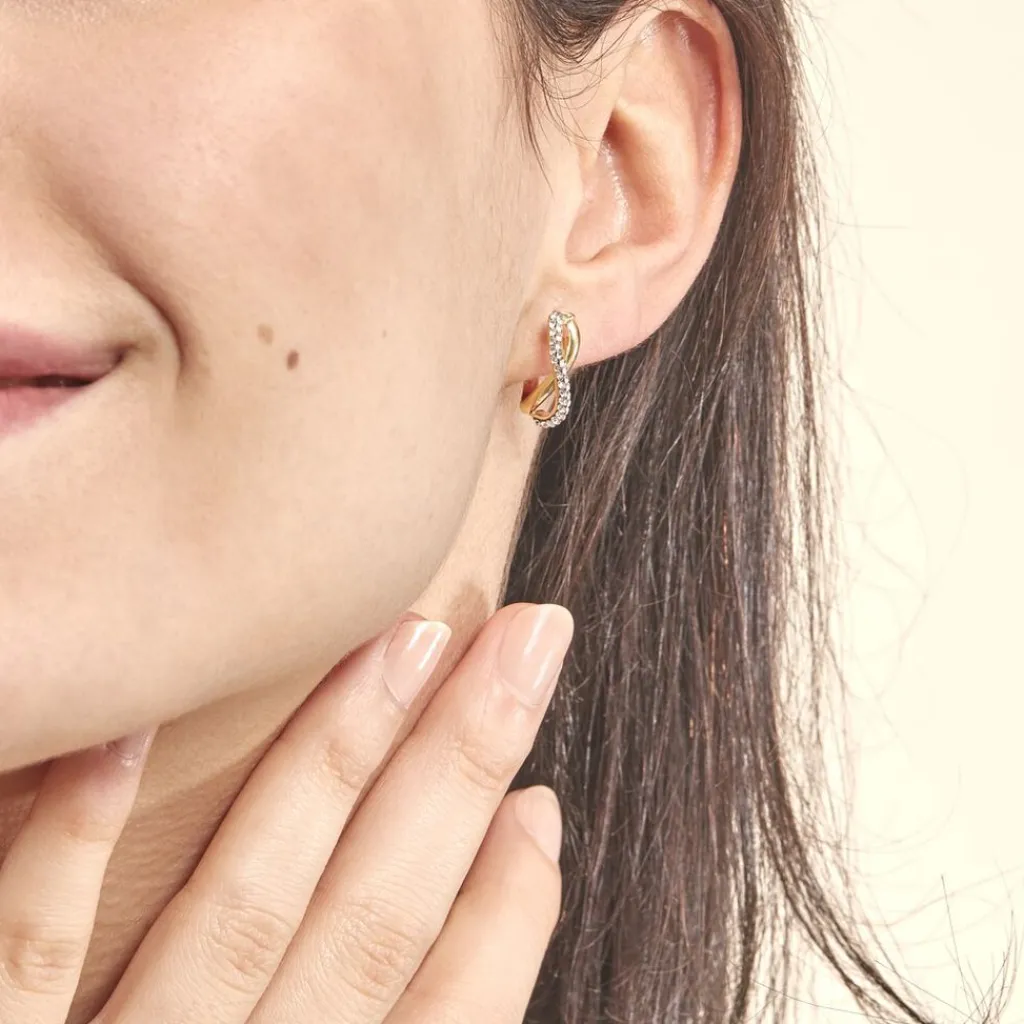 Créoles Or Jaune 375/1000 Forme Huit Deux Fils Carrés Dont Un Fil Avec Strass Largeur 2mm Diamètre 9x9mm