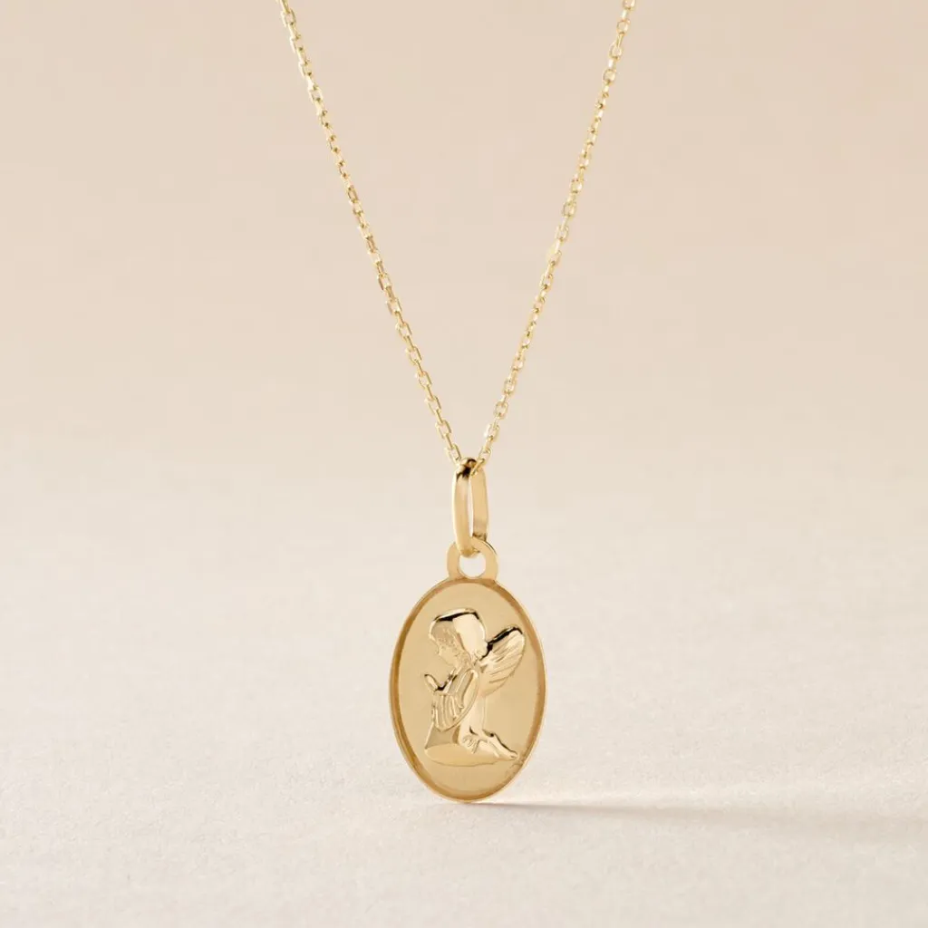 Pendentif Or Jaune 375/1000 Ovale Motif Ange A Genoux