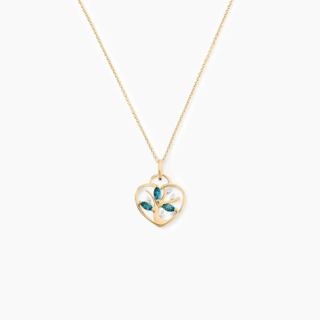 Pendentif Or Jaune 375/1000 C艙ur Arbre De Vie Topaze Bleu London Serti Griffes Et Oxyde De Zirconium Navettes