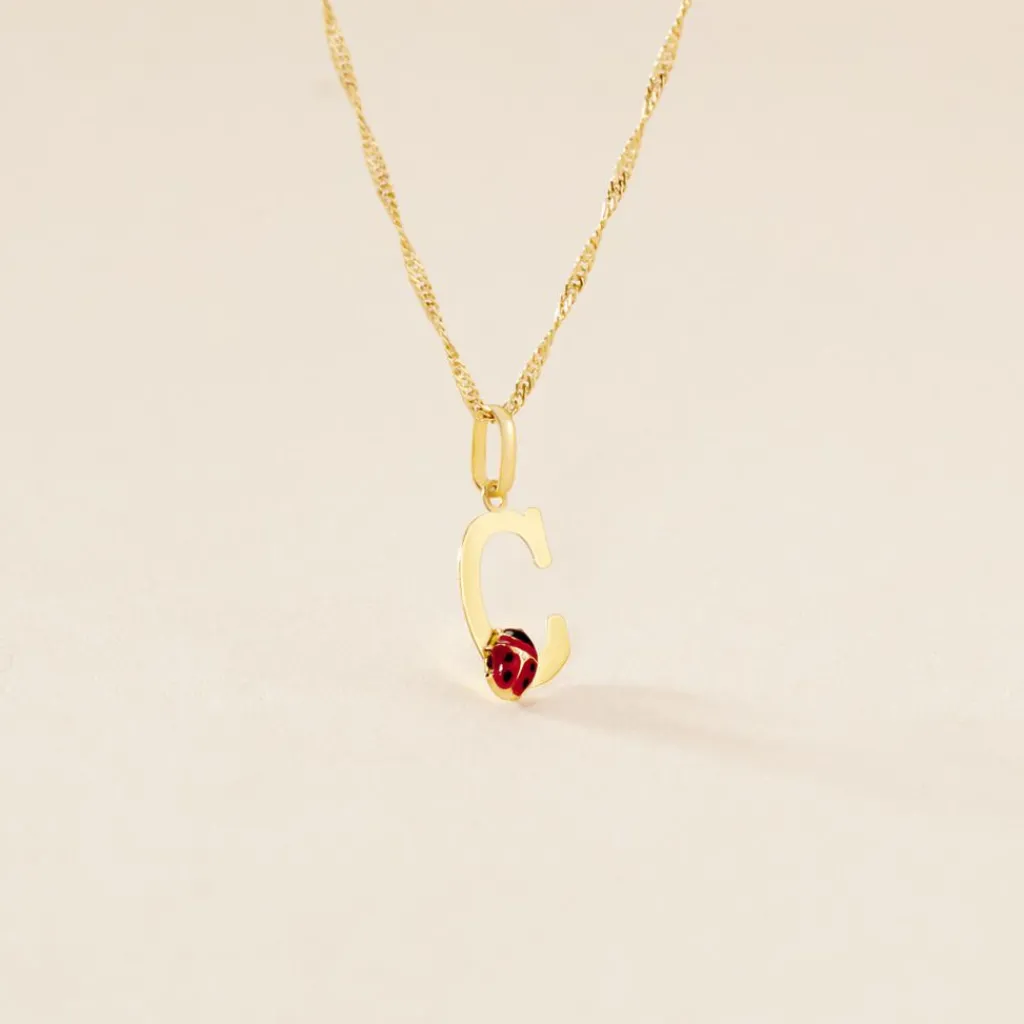 Pendentif Or Jaune 375/1000 Lettre C Motif Coccinelle Email Noir Et Rouge