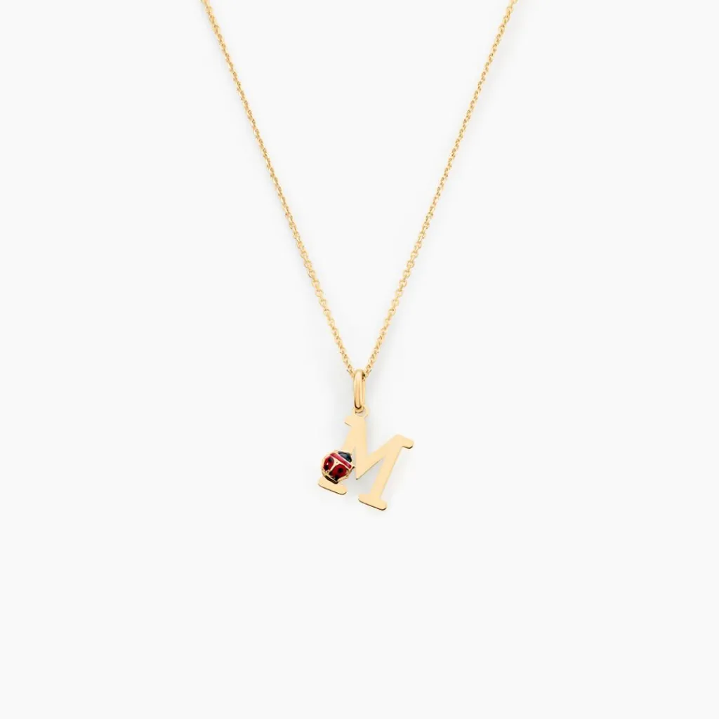 Pendentif Or Jaune 375/1000 Lettre M Motif Coccinelle Email Noir Et Rouge