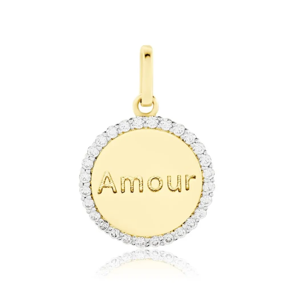 Pendentif Or Jaune 375/100 Plaque Ronde Message Amour Entourage Pavage Oxydes De Zirconium