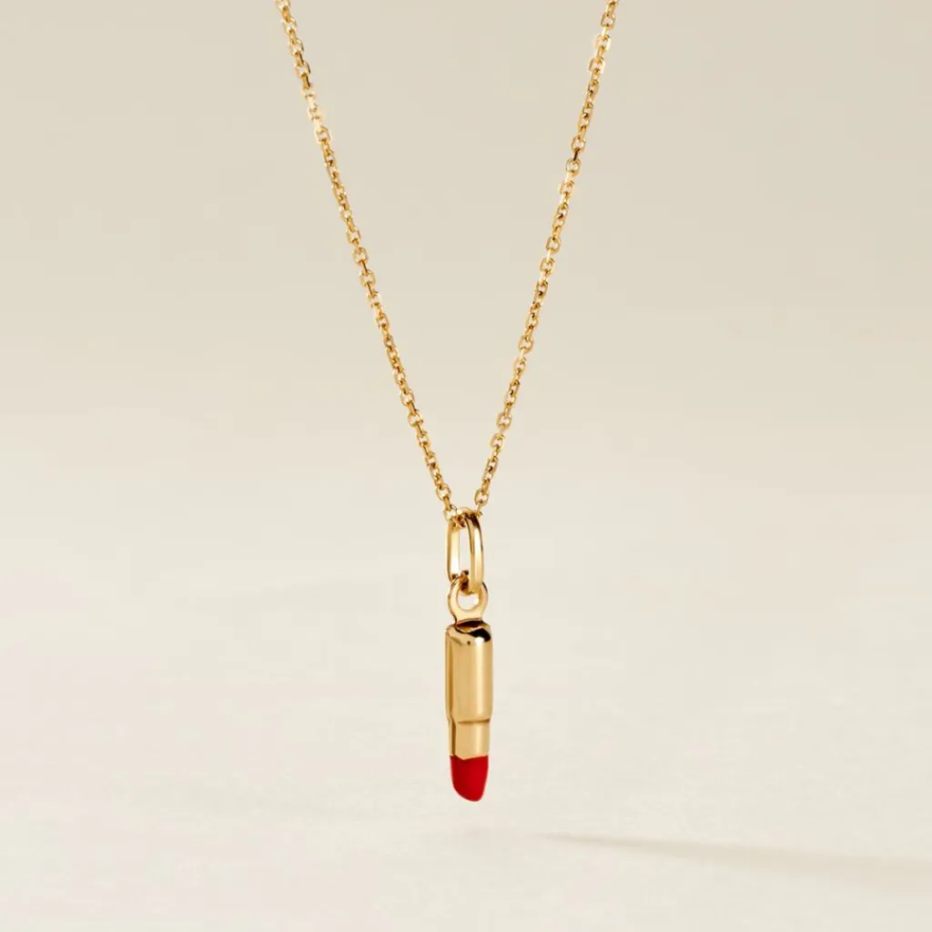 Pendentif Or Jaune 375/1000 Rouge A Levres Email Rouge