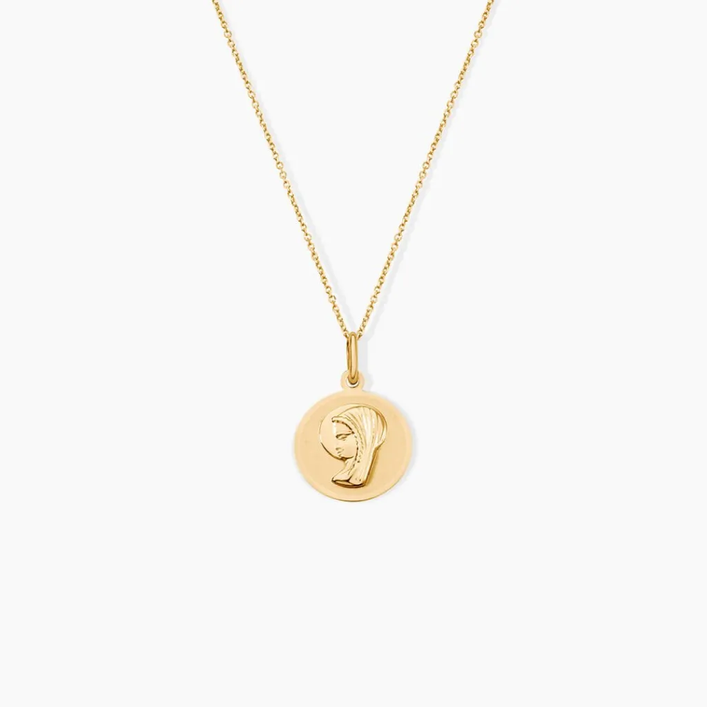 Pendentif Or Jaune 375/1000 Médaille Ronde Mat Motif Vierge