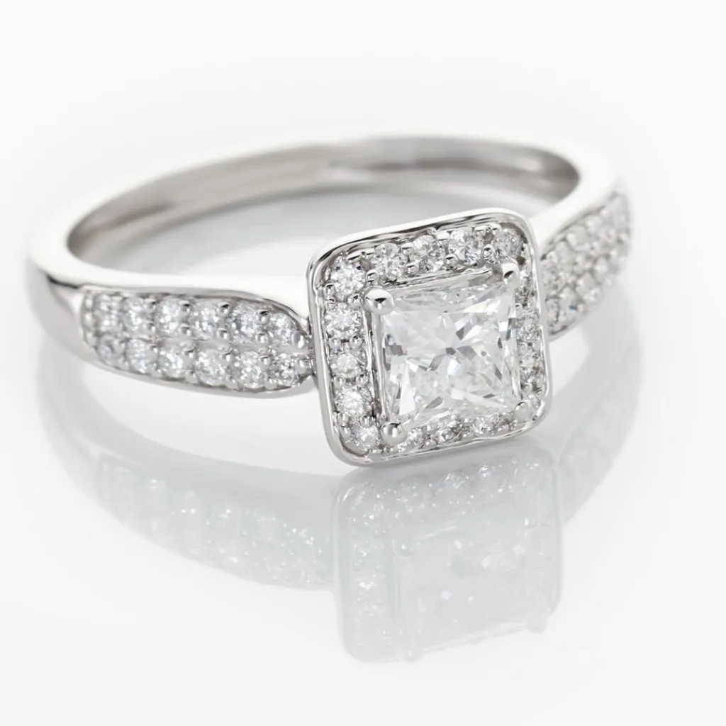 Solitaire Or Blanc 750/1000 Diamant Central Synthetique 0.50ct Taille Princesse Accompagne Diamants Synthetique Sertis Griffes
