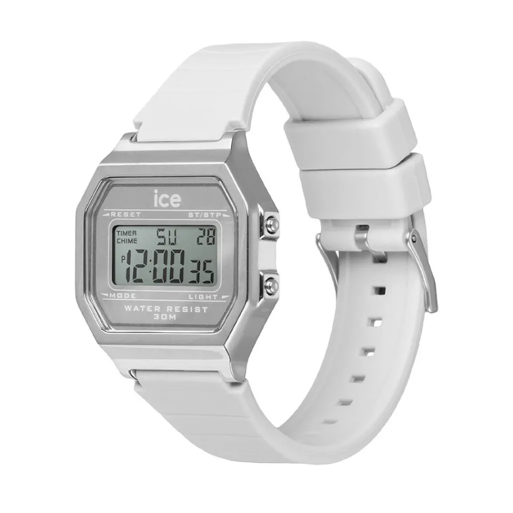 Montre Ice Watch Digit Retro Acier Argente Rectangulaire Quartz 32mm Fond Argente Bracelet Silicone Blanc 022734