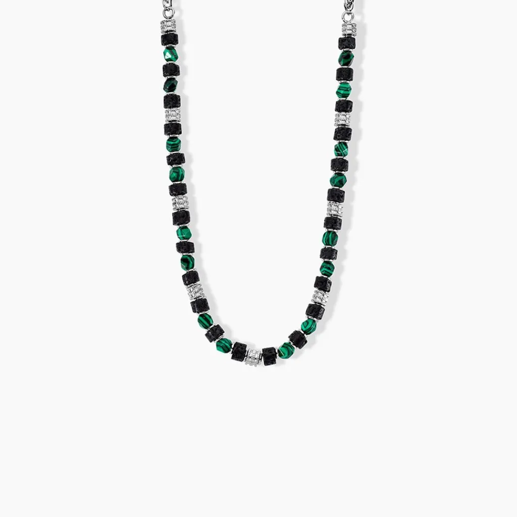 Collier Jourdan Bengale Acier Argente Malachite Verte Pierre De Lave Noire 55cm Jh250023n