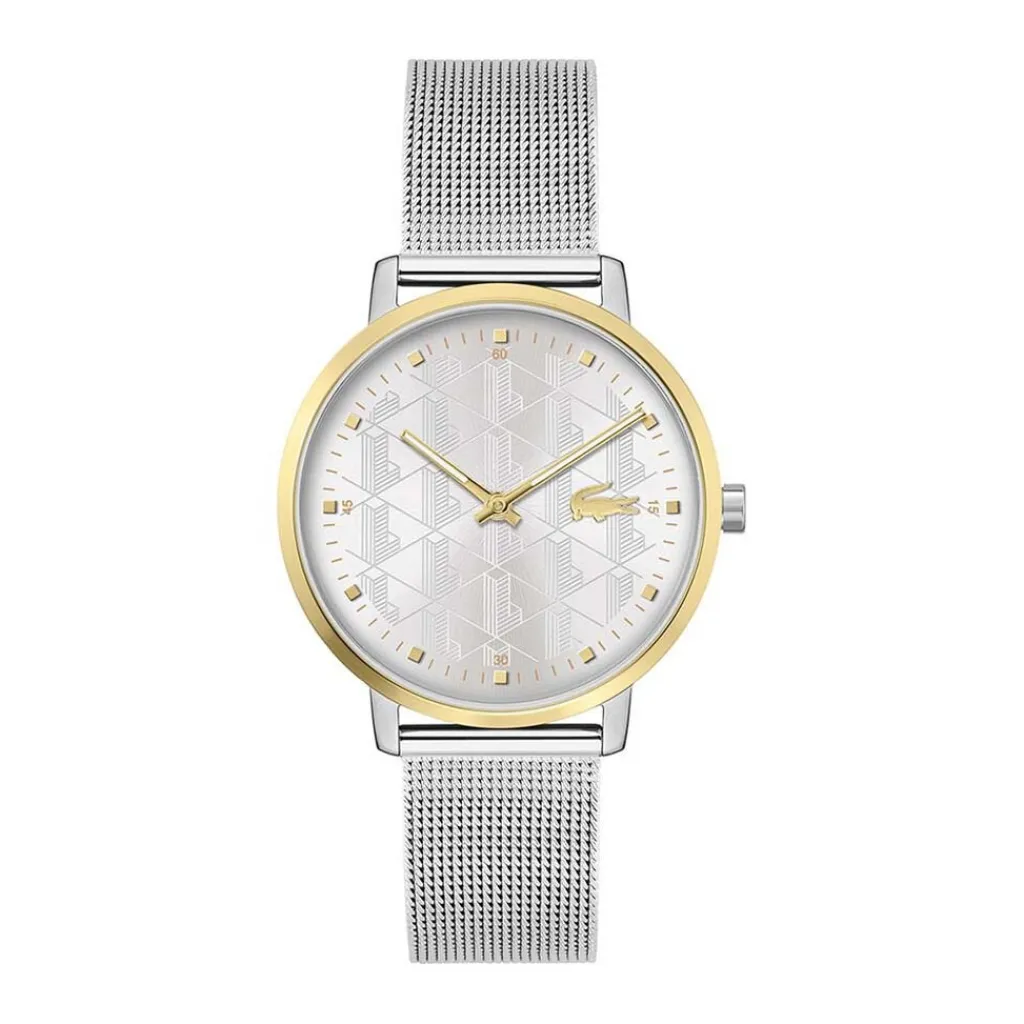 Montre Lacoste Crocorigin Acier Argenté Ronde Quartz 35mm Lunette Dorée Fond Blanc Bracelet Acier Argenté 2001286