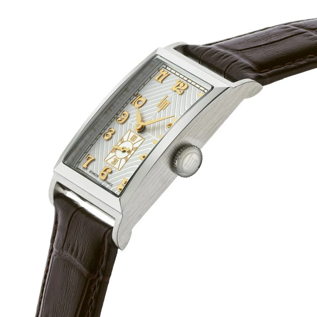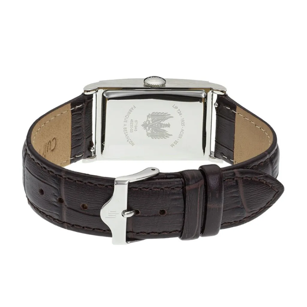 Montre Lip Churchill T24 Acier Inoxydable Argenté Quartz Rectangulaire 23,5X41,5Mm Fond Argenté Index Doré Bracelet Cuir De Veau Marron 671945