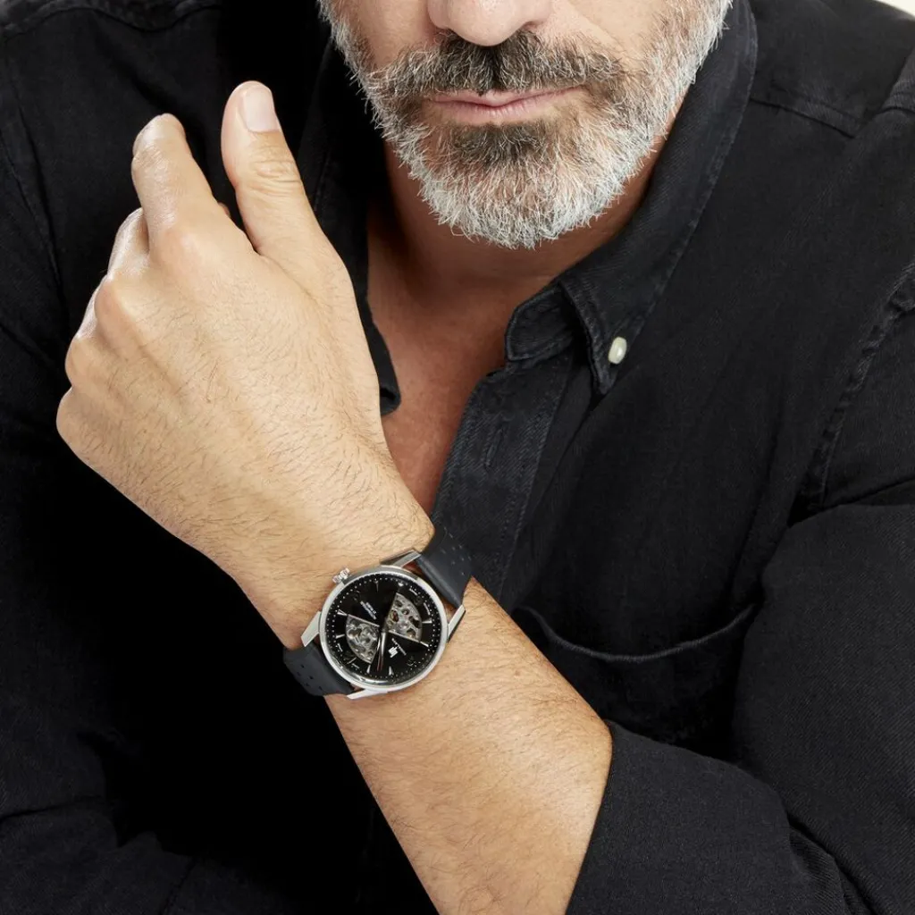 Montre Lip Himalaya Sablier Acier Argenté Rond Automatique 40mm Fond Noir Bracelet Cuir Noir 671573