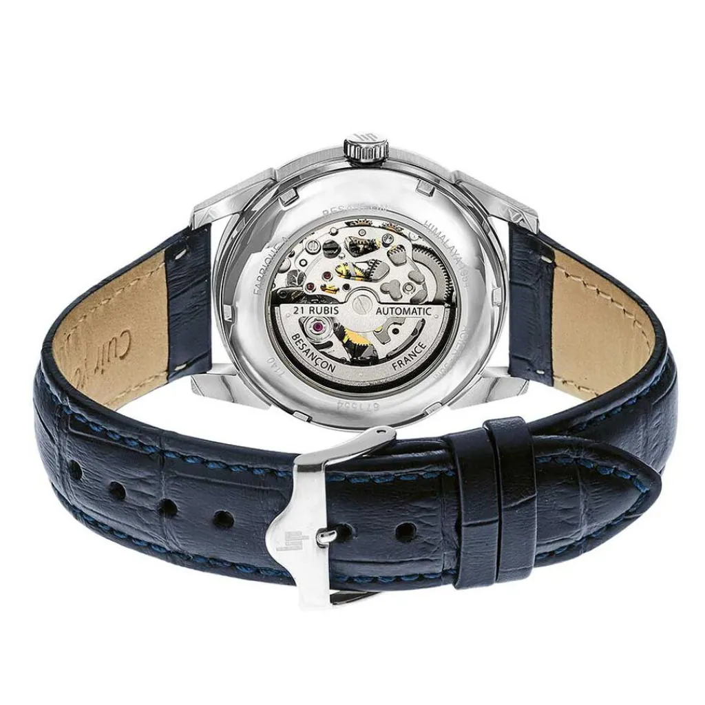 Montre Lip Himalaya Squelette Acier Argenté Rond Automatique 40mm Fond Argenté Bracelet Cuir Bleu 671554