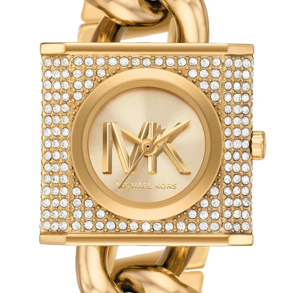 Montre Michael Kors Chain Lock Acier Dore Carre Quartz 25mm Lunette Strassee Fond Dore Bracelet Acier Dore Mk4711